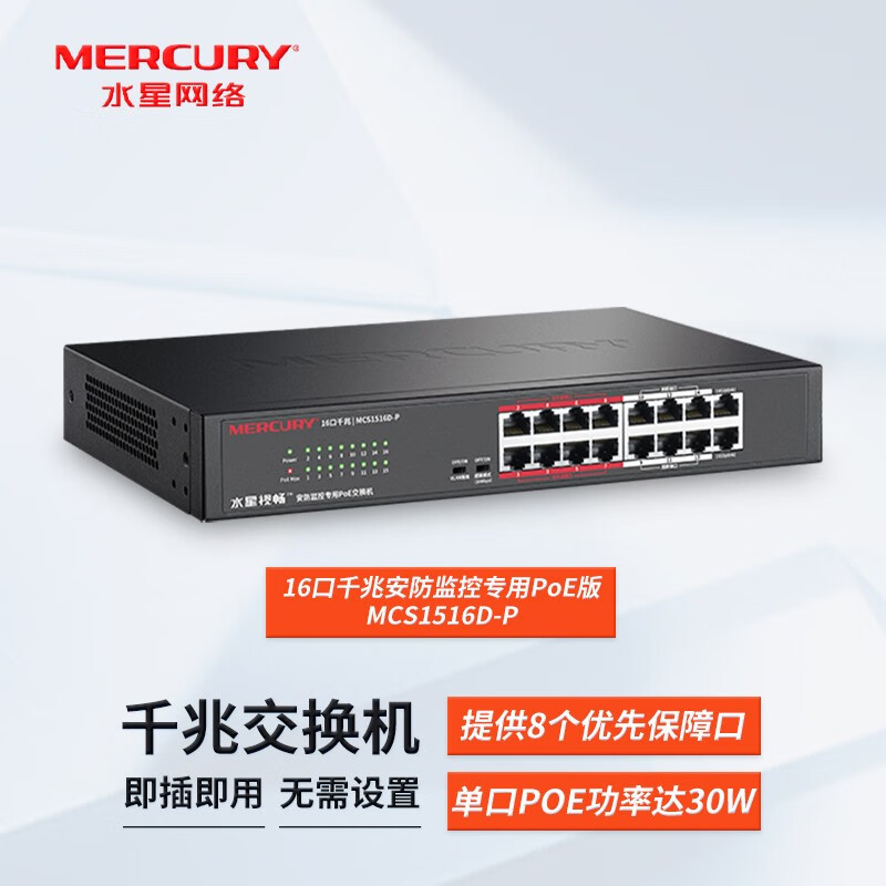 MERCURY水星MCS1516D-P千兆16口安防监控专用PoE交换机VLAN上机架